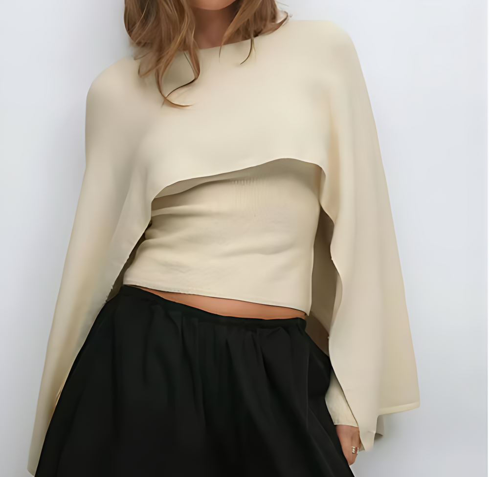 Topový pletený cape s přiléhavým střihem. Top je v melírované hnědé barvě a má horní část ve stylu ponča. Má kulatý výstřih, dlouhé rukávy a je vyroben z měkkého, pružného materiálu.